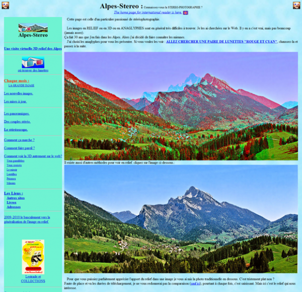 Ce site est l’œuvre de Pierre Gidon, passionné de stéréophotographie. Il présente des photos des Alpes en relief qu’il prend depuis 30 ans. Plusieurs entrées sont proposées pour découvrir ses photos, dont une carte. Pierre explique même aux internautes comment réaliser leurs propres photos en relief. Pour pouvoir apprécier son travail, chaussez des lunettes adaptées !