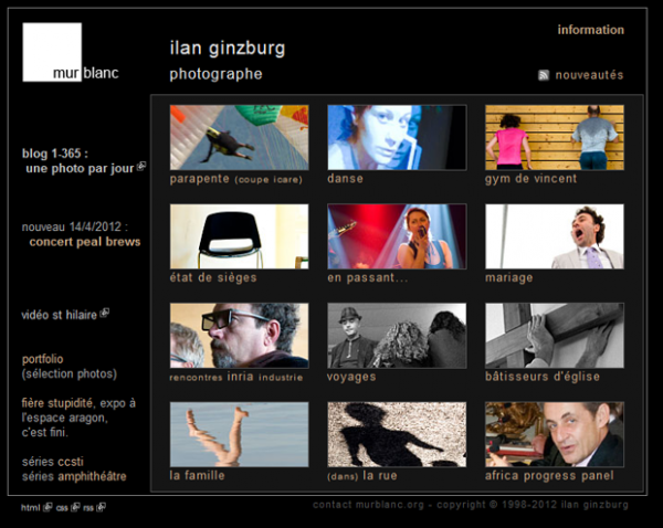 Ce site est un portfolio du travail photographique d'ilan Ginzburg (@ilanGinzburg sur Twitter). Il propose différents reportages : scènes de rue, naissances, parapente, répétitions et spectacles, mariages, voyages mais surtout culture scientifique avec des commandes des CCSTI de Grenoble et du Rhône. ilan tient également le blog 1-365 où il poste une photo par jour.