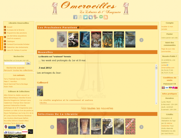Omerveilles est une librairie spécialisée dans la littérature de l’imaginaire (science-fiction, fantaisie et fantastique) située dans le quartier des antiquaires à Grenoble. Son site, plutôt bien connecté aux réseaux sociaux (@Omerveilles sur Twitter mais aussi sur Facebook, Netvibes…), propose les derniers arrivages, le catalogue de la librairie, mais aussi des critiques, le calendrier des événements…