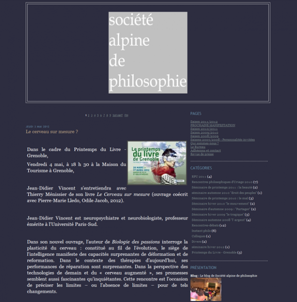 Blog tenu par la société alpine de philosophie, une association loi 1901 dédiée à la diffusion et à la pratique du savoir philosophique et liée au Département de philosophie de l'Université Pierre-Mendès-France. Le blog se nourrit de comptes-rendus de séminaires, rencontres d'auteurs, ateliers philosophiques rédigés par les adhérents à la société.