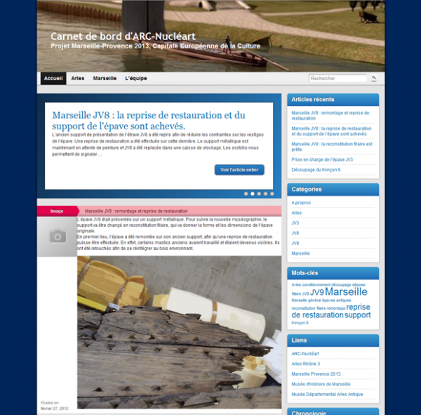 Ce blog, tenu par le laboratoire ARC-Nucléart du CEA-Grenoble, est le carnet de bord de deux grands projets de restauration liés aux villes d’Arles et de Marseille dans le cadre du projet Marseille-Provence 2013, Capitale Européenne de la Culture. Il a pour but de faire partager la vie de l’équipe tout au long de deux grandes opérations. D’une part le traitement et la restauration d’un chaland antique du 1er siècle après J.-C, en cours d’extraction à Arles et d’autre part la restauration de six embarcations antiques, datées du VIe siècle avant J.-C. au IIIe siècle après J.-C, pour le musée d’Histoire de Marseille. Le tout doit être livré en 2013. Lire notre article sur ARC-Nucléart.
