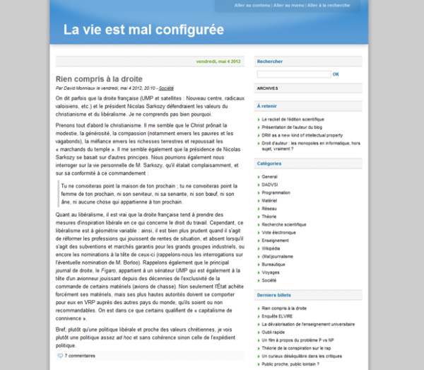 Blog tenu par David Monniaux (@dmonniaux sur Twitter), agrégé de mathématiques, docteur habilité à diriger les recherches en informatique, chargé de recherche au CNRS et professeur à l'École polytechnique. David est également membre de l'association Wikimédia France. Il exprime ses opinions sur la recherche et l'enseignement supérieur en France, le droit de la propriété intellectuelle, l'accès à l'information et aux médias et parfois des sujets techniques.