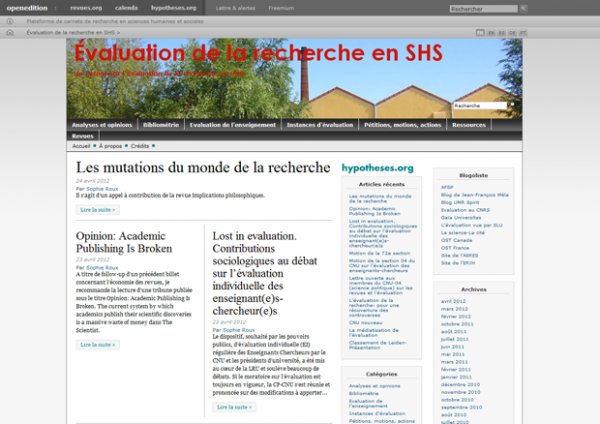 Ce blog a été conçu comme un instrument de veille et de référence sur la question de l’évaluation en Sciences humaines et sociales, devenue centrale dans les débats qui traversent la communauté scientifique. Il se propose d’offrir le panorama le plus complet possible, sous forme de billets thématiques, permettant à la fois de suivre l’actualité en la matière et consulter l’ensemble de la documentation disponible. Initialement tenus par les parisiens Emmanuelle Picard, Claire Lemercier et Sylvain Piron, le blog s’est enrichi des contributions de la grenobloise Sophie Roux, maître de conférences en Philosophie à l’Université Pierre-Mendès-France.