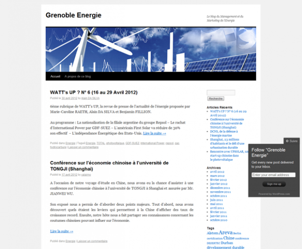 Grenoble Energie est alimenté par une communauté d’enseignants-chercheurs, d’étudiants et d’acteurs économiques spécialistes des questions énergétiques, sous l’égide entre autres d’Olivier Cateura (@oliviercat sur Twitter), professeur de management stratégique et de Céline Jullien, professeur de management de l’énergie à Grenoble Ecole de Management. Ce blog a pour objectif de mettre en lumière les projets, actions et idées en lien avec l’énergie (innovations technologiques et marketing, géopolitique et économie de l’énergie, stratégie d’acteurs et nouvelles régulations…), avec un focus particulier sur l’écosystème grenoblois.