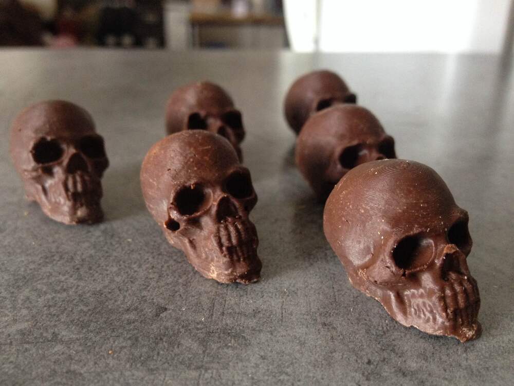 Pour l'inauguration de l'exposition, nous vous préparons des petits crânes en chocolat réalisés à partir d'un moule en silicone fabriqué au Fab Lab de Grenoble ! Retrouvez la recette de ce moule sur le site du Fab Lab et... venez fabriquer les vôtres !
