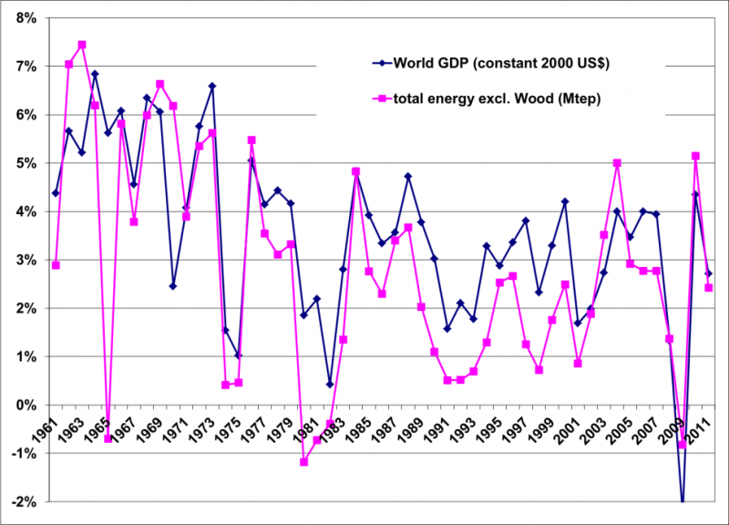 Descriptif : l’évolution du PIB depuis 1961 suit en grande partie l’évolution de l’énergie consommée (énergie nécessaire à la transformation de bien finis[1])