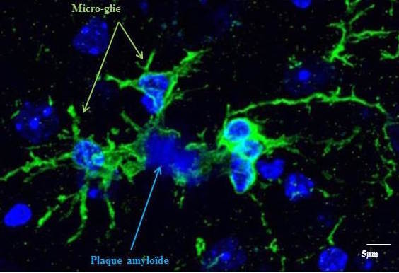 Les démences en général et la maladie d'Alzheimer en particulier, sont associées à l'accumulation dans le cerveau d'un peptide appelé béta-amyloïde qui a tendance à s'agréger en petits paquets. Ces agrégations, nommées "plaques séniles" ou "plaques amyloïdes" sont toxiques pour les neurones et participent à la neurodégénérescence qui caractérise ces maladies. Ce processus est accéléré lors d'une production excessive de béta-amyloïde ou lorsque le système enzymatique qui régule tout ça ne fonctionne pas (plus) très bien... Heureusement, nous avons dans le cerveau des petites cellules appelées cellules microgliales ou "microglies" qui sont l'équivalent des macrophages qui circulent dans le sang et qui permettent de réagir aux agressions microbiennes . Ces microglies patrouillent en permanence dans notre cerveau, localisent rapidement un phénomène anormal et potentiellement toxique et le neutralisent. Circulez, y’a rien à voir ! (voir aussi)