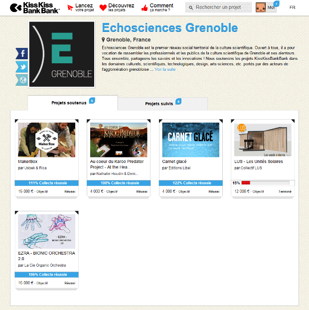 Echosciences Grenoble a pour l’instant le statut de "mentor" sur la plateforme KissKissBankBank. C’est-à-dire que nous ne sommes pas directement "porteurs de projets". Par contre, nous soutenons les projets dans les domaines culturels, scientifiques, technologiques, design, arts-sciences, etc. portés par des acteurs de l'agglomération grenobloise et de l'Isère et/ou à destination de ce territoire. Nous assurons la promotion de ces projets et la mobilisation de nos réseaux, nous favorisons les échanges, les partenariats et ouvrons notre carnet d'adresse. Malheureusement, nous ne pouvons pas financer directement ces projets ! Nous allons également travailler avec Ulule très bientôt, notamment en accueillant une étape du Ulule Tour 2015 le 2 avril au Stade des Alpes dans le cadre de notre 4ème Forum des projets.