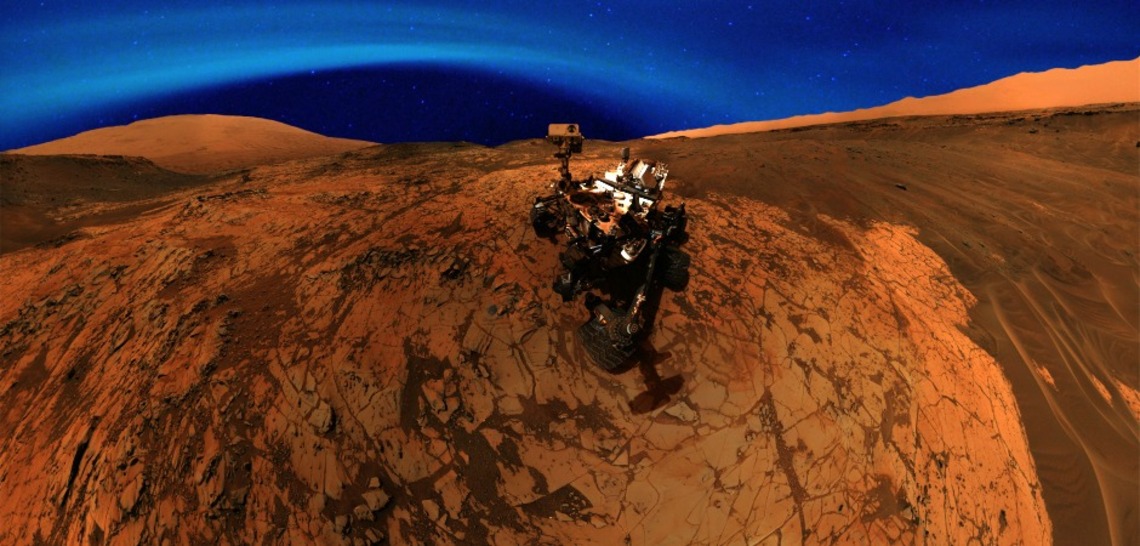 Une interprétation par les co-auteurs de l'article scientifique, montrant à quoi les aurores martiennes bleues doivent ressembler, vues par le rover de la NASA Curiosity, à proximité des anomalies magnétiques de Mars. En réalité, ce bleu se mêle de vert, et au dessus se trouve une couche rouge !