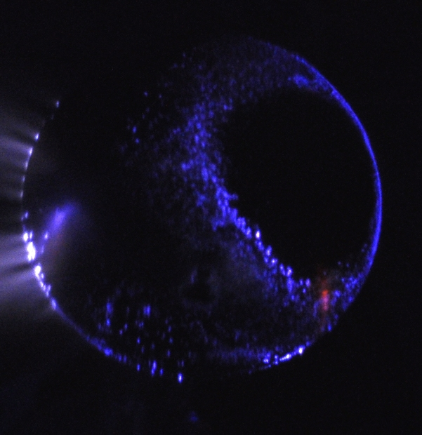 Une polémique scientifique se développe autour des énergies électroniques à l’origine des aurores : 500 eV ou plus ? Pour en avoir le cœur net, la Planeterrella est remplie de dioxyde de carbone. Nous faisons l’expérience en avril 2015. Et à notre grande surprise, nous observons des aurores bleues. De retour au labo, un peu de bibliographie nous apprend que ce rayonnement, dû à la bande Fox-Duffenbak-Barker du CO2, est bien connue des spectroscopistes. Nous introduisons les données atomiques de la bande FDB dans notre code ionosphérique et nous pouvons modéliser l’émission dans la Planeterrella. Mais pour Mars, il nous faut connaître l’énergie des précipitations la nuit, au dessus des anomalies magnétiques.