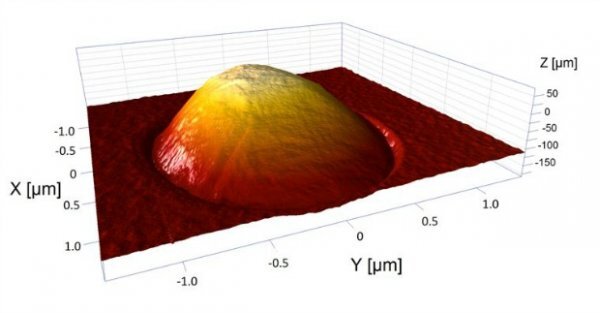 - Les propriétés du graphène permettent de plus d’obtenir des membranes souples qui peuvent être facilement manipulées et suspendues. On peut par exemple déposer une couche de graphène sur un tapis d’objets piquants sans que celui-ci soit endommagé. L'image ci-dessous à été obtenue par un microscope à force atomique et montre une membrane de graphène déposée sur une grille de Silicium et suspendue au dessus d’une cavité cylindrique de 1 micromètre de diamètre. On peut donc imaginer poser une telle couche de graphène au-dessus de n'importe quelle autre structure...