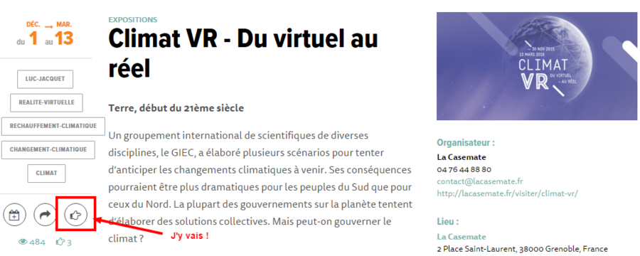Pour les événements, vous pouvez indiquer que vous comptez vous y rendre en cliquant sur l'icône “J’y vais” :