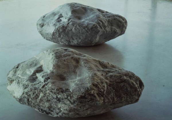 « Être fleuve ». Refaire une pierre sortie d’un fleuve à l’identique. Ou presque car, en réalité, comment atteindre cette identique ? Impossible. De toutes façons, même pas tout à fait identique, bien difficile à faire. Mais quelle idée ? Quelle magnifique idée ! Sur cette pierre sortie de l’eau, des courbes, résultats d’une usure imperceptible de la surface, sur des temps au delà de l’homme, et qui rencontrent le cœur de la pierre, son volume, ses irrégularités, ses spécificités donc. Comme on ne se baigne jamais deux fois dans le même fleuve, il n’existe pas deux pierres identiques. Quelle histoire raconte cette reproduction ? Où porte-elle notre regard et notre attention ? Sur cette longue durée, l’usure de l’eau imperceptible, mais toujours active, veut des courbes longues aux surfaces bien polies. Les inhomogénéités et les fractures au cœur de la pierre viennent contrarier cette usure patiente et modifier l’évolution permanente de la forme. Notre œil rapidement, notre toucher si nous le voulons, lisent cette infiniment lente évolution et ces accidents. Copier la pierre, c’est explorer ce travail de l’eau sur la roche. Se projeter dans cette immense durée. Giuseppe Penone insiste : « pour faire cette pierre, je dois me mettre à la place de la rivière ». Refaire c’est peut être pour l’artiste entrer plus profondément dans cette réalité et conduire le visiteur à regarder avec toute son attention et à caresser ce caillou mémoire du mouvement.