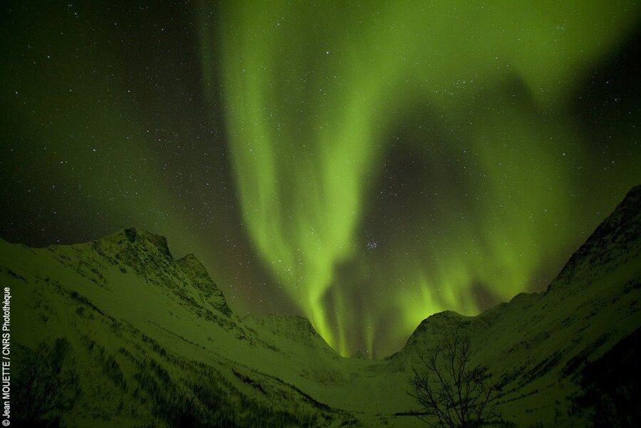 Aurore boréale en Norvège, près du glacier Steindalen. Le 14 mars 2010, à environ 70° de latitude nord, dans la région de Tromsø, Alpes de Lyngen. ©Jean MOUETTE / CNRS Photothèque (Source)