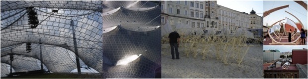 Images de références. Frei Otto, Stade olympique de Munich (Flickr), Theo Jansen, artiste sculpteur néérlandais (wikimedia commons), Institute for Advances Architecture of Catalonia (Heliocell)
