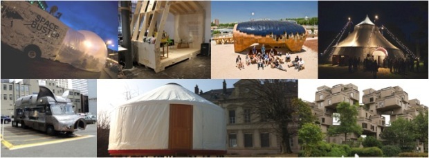 The space Buster (Flickr) ; Wikouse making at MAKlab (Flickr) ; Fab Lab House, Barcelona (Flickr) ; Le chapiteau des Colporteurs pour leur spectacle Le Bal des Intouchables (Flickr) ; Maximus Minimus food truck Seattle Washington (wikimedia) ; Yourte de l’Atelier Arts Sciences (Grenoble) ; Habitat 67, Montreal, assemble de containers (wikimedia, CC).