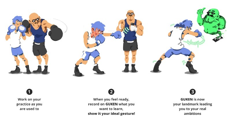 Va-t-il devenir plus facile d’entrer dans un sport avec un iCoach et des « miroirs » numériques qui vous renvoient et vous font percevoir vos progrès en temps réel ? Peut être, voire probablement, comme je le découvre auprès de Adrien Husson, ingénieur et designer, fondateur de la startup Guken (Gesture learning experience) incubé dans l’Openlab du Centre de Recherches Interdisciplinaires (CRI Paris) de l’Université Paris Descartes, et de Axel Jean-Théodore, le matheux de l’affaire.