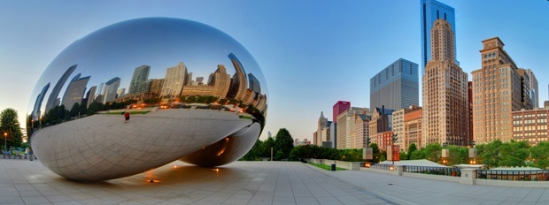 Ça, je l’ai vu deux fois en quelques années et je ne m’en lasse pas. Sky Mirror, semble-t-il, ne fut déjà pas facile à fabriquer. Cloud Gate, ou le haricot, semble avoir été un vrai défi technologique. Un haricot miroir posé sur le sol. 168 plaques d’acier inox soudées. Hauteur 10 mètres pour une base de 20 m x 13 m. Et en fait il faut bien cela ! Plus petit n’est pas possible. Il faut vraiment cela pour prendre sa place dans le Millennium Park et pour réaliser l’ambition du projet. Un miroir haricot géant pour jouer de la lumière et tout mélanger à Chicago, de jour comme de nuit. C’est frappant : la ville de Chicago est le bon endroit pour Cloud Gate avec une géographie autour de Chicago très simple. D’un côté le Middle-West, le plat pays américain sur des distances infinies. Inouï pour un français qui vit dans un pays où tout change en quelques dizaines de kilomètres. Là, rien ne change pendant des heures et des heures de route. De l’autre côté le lac Michigan. Une surface d’eau équivalente à un dixième de la surface de la France. De l’eau jusqu’à l’horizon d’un côté et de l’autre des champs de maïs sans fin. Le ciel au-dessus. A coté du Millenium Park, de Cloud Gate, au bord du lac, la ville de Chicago avec sa Skyline. Des skyscrapers, ou gratte-ciels, qui pointent vers le ciel dans ce monde plat. Dans cette ville, plus de 100 buildings qui culminent à plus de 150 mètres. 442 mètres pour le plus haut. La nuit, c’est simplement magique.