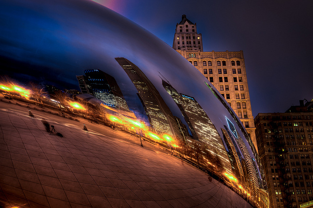 Cloud Gate, la nuit (crédit : Dave Wilson / Flickr, licence cc)
