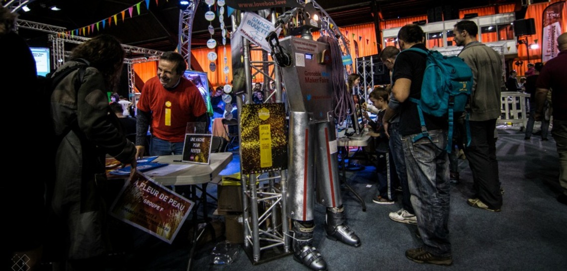 Dimanche 4 octobre 2015, à la Halle Clémenceau de Grenoble. Les banderoles nous le confirment, nous voilà enfin arrivés à la Grenoble Mini Maker Faire, organisée dans le cadre de la Fête de la Science. De l’extérieur, tout paraît paisible, et pourtant… une agitation se fait entendre. Le décor nous le confirme, nous quittons le soleil de cette journée d’octobre pour entrer dans les méandres des sciences, dans le brouhaha des cerveaux… Au milieu d’une foule dense et effervescente, nous sommes directement pris à parti par un sympathique "robot love", symbole du sujet d’aujourd’hui : la robotique !