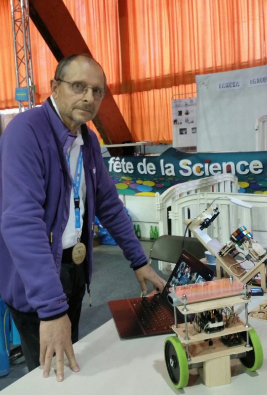 Nous partons alors à la rencontre d’Yves, jeune retraité passionné de robotique, en plein échange avec des curieux qui observent son robot résoudre un Rubik’s cube. Un curieux lui demande : « sinon avec l’analyse d’une seule face il est possible de résoudre l’algorithme en entier ? ». Réponse d'Yves : « c’est une très bonne question ! Je pense que cela pourrait être possible si le robot fait un test en effectuant une rotation supplémentaire … il faudrait y réfléchir ! ».