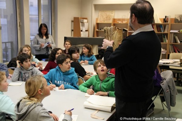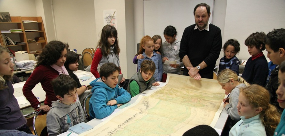 Ensuite, les élèves ont été accueillis par le Service Éducatif des Archives Départementales. Ils ont approché la mémoire du risque, examiné des cartes et documents rares, parcouru les réserves inaccessibles au public. Ce moment leur a permi de découvrir les fonctions des Archives : collecter (trier, jeter), classer (mettre une cote), conserver (34 kilomètres de rayons), communiquer (sous réserve de secret, de fragilité) et d'examiner notamment la "Carte du cours de l’Izère" (photo de Une) et le "Grenoblo Malherou" (les Malheurs de Grenoble dus à l’inondation de 1733), poème anonyme en patois attribué à Blanc la Goutte et ultérieurement illustré par Diodore Rahoult.