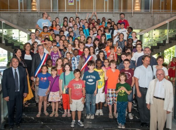 Pour couronner ce travail et cette belle réussite, la Ville de Grenoble a accueilli les lauréats, le 1er Juillet dernier et leur a offert un délicieux goûter. Après avoir présenté leurs dossiers, dans la salle du Conseil municipal, et notamment énuméré les crues emblématiques, depuis 1219 (vidange brutale d’un lac constitué dans la plaine du Bourg d’Oisans derrière un barrage naturel formé par les cônes de déjections affrontés de la Vaudaine et de l’Infernet), jusqu’à 2010, les enfants posent sur le grand escalier de l’Hôtel de Ville, en compagnie de leurs professeurs, leurs accompagnateurs, les élus et Monsieur le Maire.
