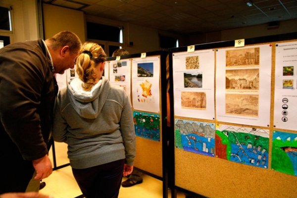 Le dossier réalisé par les CM2 d’Anthoard a fait l’objet d’une présentation préalable, à laquelle furent invités les parents. Ci-dessous, une élève présente les pages du dossier, qui associent gravures, photos, cartes et dessins représentant Grenoble inondé, dont émergent les immeubles et que survolent les hélicoptères.