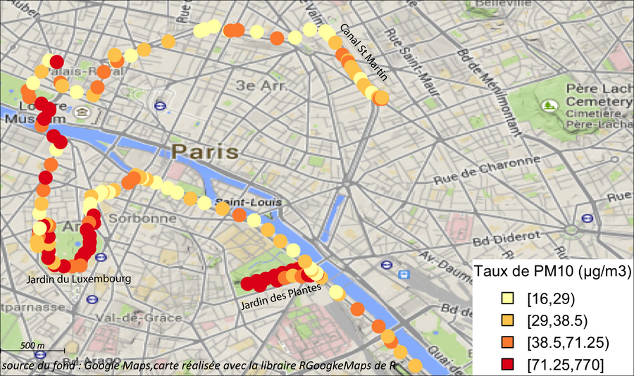 L’analyse et la compréhension des données de pollution atmosphérique sont très complexes et nécessitent pour les néophytes de nombreuses clefs de compréhension. Nous sommes exposés à des cocktails de polluants qui peuvent interagir entre eux. Ils sont très variables selon les sources d’émission et les conditions météorologiques, mais aussi selon ses activités, les lieux fréquentés et ses modes de déplacements. Par exemple, sur la figure 2, j'ai réalisé des mesures de concentrations de particules sur un des parcours les plus fréquentés pour la course à pied à Paris et une forte variabilité spatiale a été observée. Selon les saisons, ce sont différents types polluants qui ont des niveaux élevés. Certains sont plus forts à proximité de sources d’émission et d’autres non… Ce sont beaucoup d’éléments que l’indice journalier de qualité de l’air ne montrent pas, même s’il permet de savoir si l’air aujourd’hui est plutôt pollué ou non.