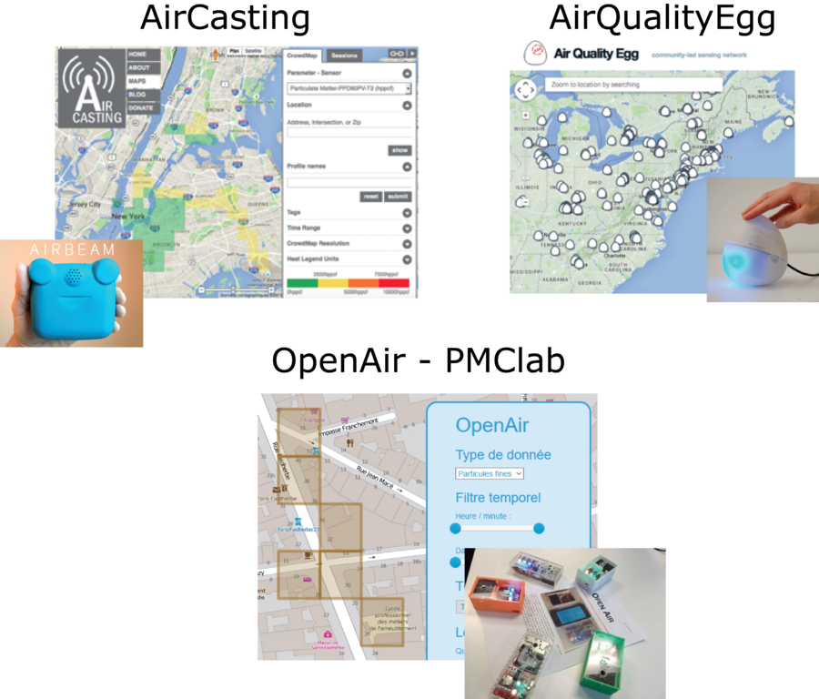 Figure 3 : Exemple de capteurs et de visualisation dans des projets participatifs (AirCasting, Air Quality Eggs et OpenAir)