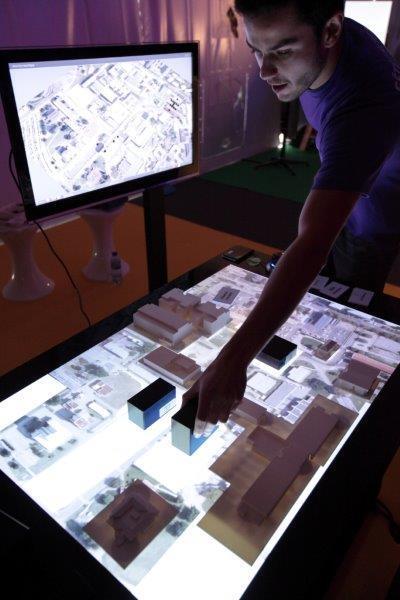 >> "Villes contemporaines et numériques" (jeudi 10 octobre 2013). Les technologies numériques participent de manière croissante à la production, au fonctionnement et au devenir des villes contemporaines. Les champs d’application sont considérables et intéressent des domaines aussi vastes que la mobilité, l’habitat, l’architecture et l’urbanisme (maquettes urbaines interactives), l’environnement (smart grids), la sociabilité (bornes d’informations digitales interactives ; « 5ème écran »), la culture (valorisation numérique du patrimoine), les loisirs (jeux en réalité augmentée), etc. Si le phénomène d’intégration des innovations techniques dans la fabrique des villes n’est pas nouveau, on observe néanmoins une accélération du processus, nécessitant par là même un temps de réflexion et de débat autour de l’apport et des limites des villes dites « numériques ». Dans cette perspective, EXPERIMENTA a incité de nombreux visiteurs à naviguer dans une maquette et une borne urbaine interactive (Dasein Interactions ; Pôle Supérieur de design de Villefontaine, Polytech Grenoble), tester une application numérique géo-temporelle et nomade (Le Récitoire – SFR Fab Ter), ou encore interroger l’apport des technologies numériques dans l’espace-temps des transports urbains (Hubway – Orange Labs).