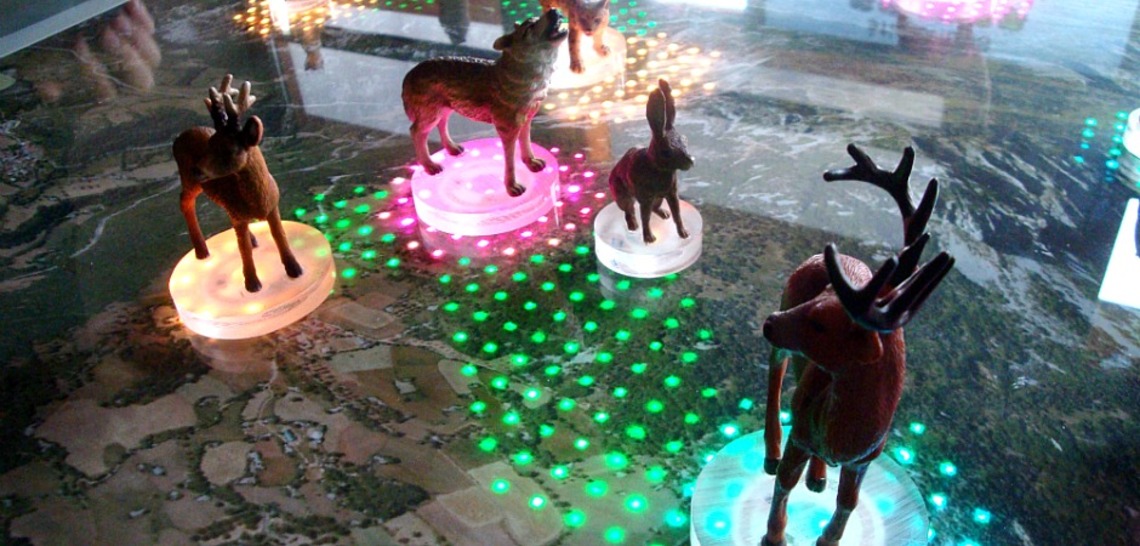 La scène ressemblerait presque à une partie du jeu de société Risk - version biodiversité - mais avec un petit détail en plus. La dalle d’une surface d’un mètre carré est dotée de 1600 antennes RFID et interagit avec les « pions », eux-aussi munis de puces RFID. Ainsi, au pied de chaque figurine, la table s’allume de la couleur du joueur et les animaux « interagissent » de différentes manières. Un écran séparé présente les caractéristiques des bêtes et du paysage (plus de détails ici).