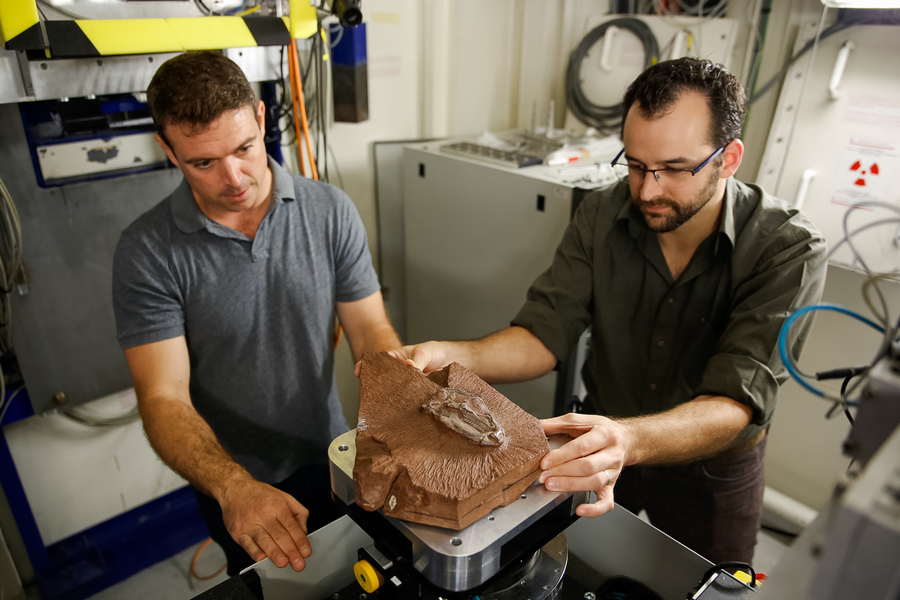 Les paléontologues Jonah Choinière et Vincent Fernandez dans la pièce où a été scanné le fossile