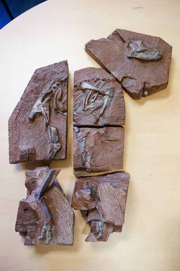 Les différents morceaux du fossile de cet Heterodontosaurus, eux, sont posés sur la table de la salle voisine, façon puzzle. L’animal, étroitement emprisonné dans sa gangue rocheuse n’est pas très gros (1m – 1m20) et a de longues canines. Il fait partie de l’ordre des Ornitischiens auquel appartiennent également les très connus tricératops et stégosaures. Jonah Choinière laisse les journalistes assembler le puzzle, rectifie une position et montre la colonne vertébrale, visible en coupe sur le rebord de la roche. « Il y a encore beaucoup de choses que nous ne connaissons pas à propos des jeunes dinosaures herbivores, commente-t-il, et nous avons besoin de nouveaux spécimens comme celui-ci et de nouvelle techniques comme celles du synchrotron pour résoudre ces questions ».