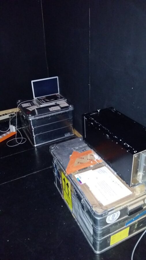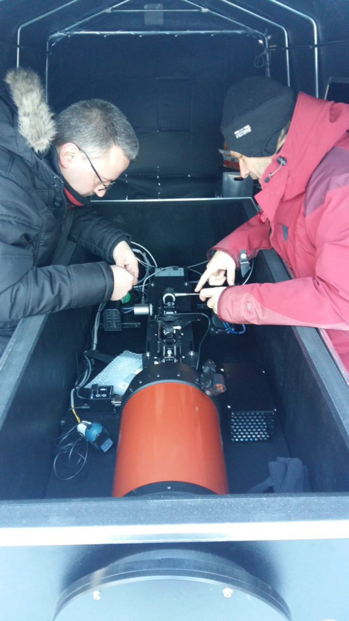 Dehors, on commence à monter l'optique de Premier Cru. Cet instrument est très gros, il ne rentre pas dans le bâtiment. Il faut donc faire ces réglages dehors. Manipuler des petites vis d'optique (imaginez la taille de celles des branches de lunettes) par ces températures n'est pas évident. Une partie du spectromètre lui-même est à l'intérieur, relié au reste par une fibre optique. On passe la fibre par les passages câbles.