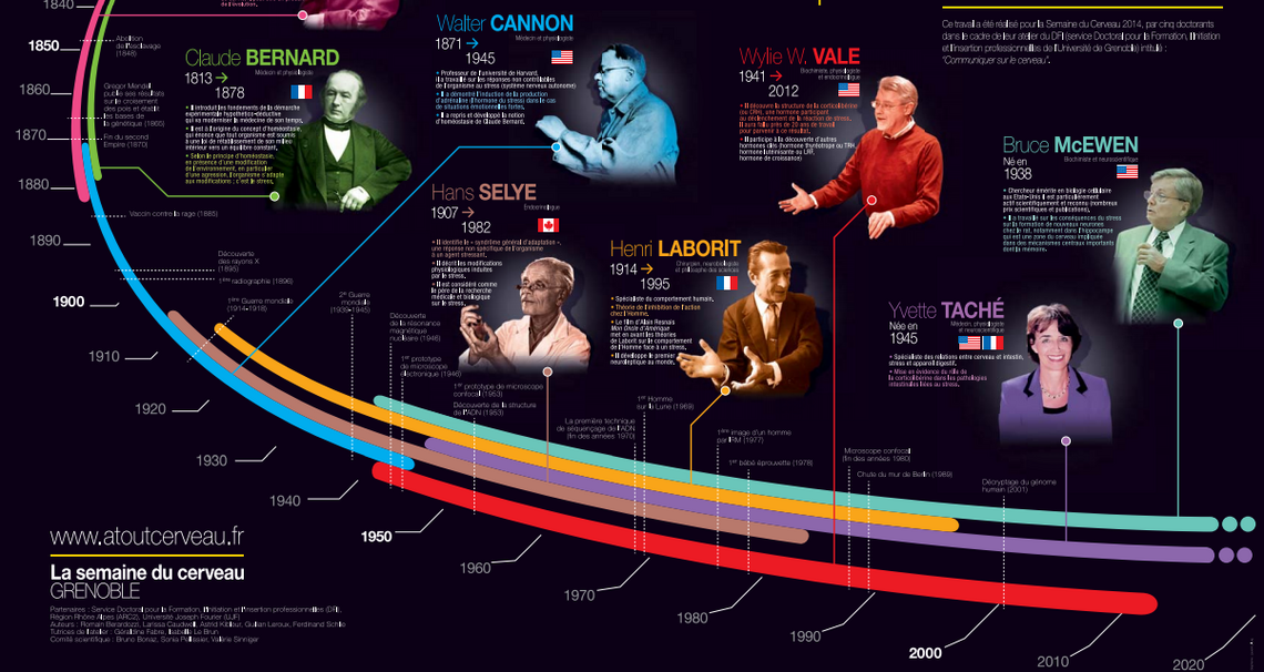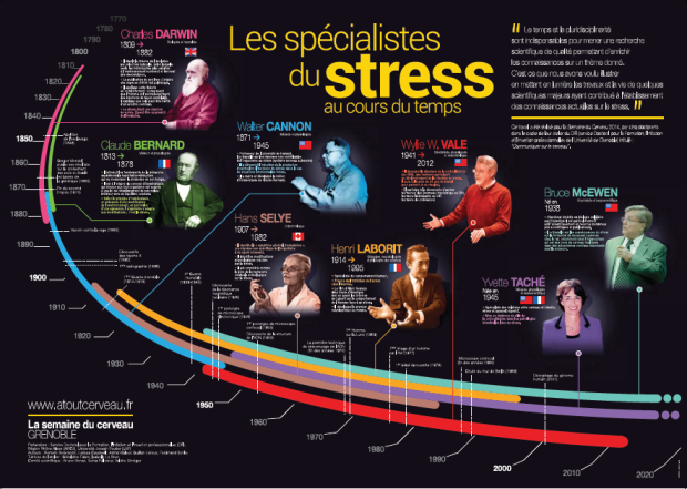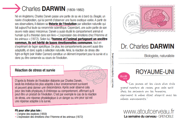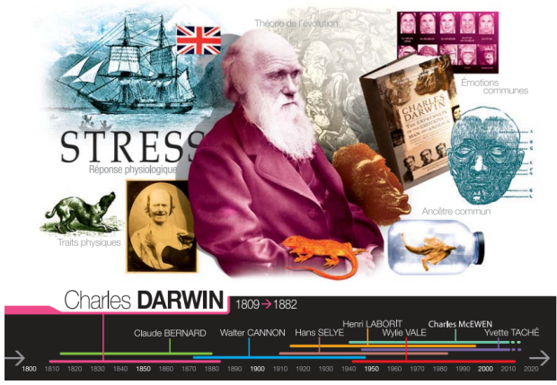 Ils ont ainsi établi une chronologie de la recherche sur le stress, en mentionnant quelques personnages célèbres ayant contribué et leur apport respectif. Le tout sous un format innovant : des biographies sous forme de cartes postales, reliées par une frise chronologique. La conception graphique des cartes et de la frise a été assurée par Laurent Lelong. Cette semaine, nous vous proposons de découvrir la frise et la carte de Charles Darwin (à télécharger en bonne définition via les liens sous l'article). Retrouvez une nouvelle carte chaque semaine sur ce blog !