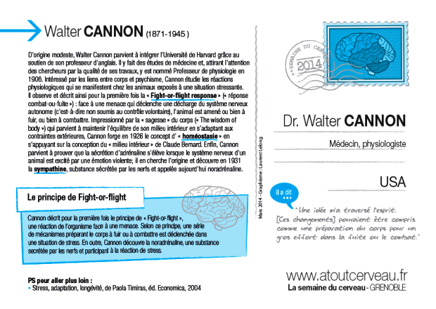 Cette semaine, place à la carte postale sur Walter Cannon. Ce chercheur a pousuivi les travaux de Claude Bernard sur l'homéostasie et adéfini le principe de Fight-or-Flight.
