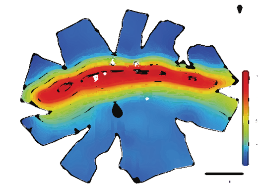 Figure modifiée d'après l'originale (figure 2 de l'article Nagloo N et al., Journal of Experimental. Biology (2016) 219, 1394-1404). La densité des photorécepteurs est représentée selon un code couleur (la zone de plus grande densité est rouge). Notez la position de l'émergence du nerf optique (tâche noire).