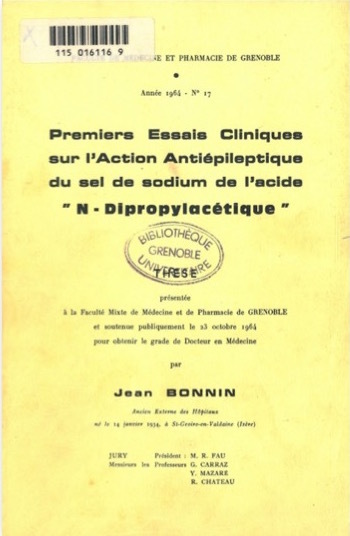 L'année suivante (la loi Huriet (1) n'existait pas encore !), les premiers essais chez l'homme sont réalisés au service de Neurologie de l'hôpital de Grenoble par Simone Garrel, alors interne dans ce service (2). Les premiers patients souffrant d'épilepsie et qui reçoivent du valproate sont enchantés : ils ne font plus de crises et ne se sentent pas pour autant "abrutis", comme c'est souvent le cas avec les barbituriques. L'étude clinique se poursuit avec 37 patients dont 29 sont améliorés "parfois remarquablement" comme le souligne Jean Bonnin dans sa thèse de médecine présentée le 23 octobre 1964. Les choses vont vite et on est loin des années nécessaires aux essais cliniques multicentriques auxquels doivent être soumis les médicaments "candidats" actuels. En 1967, le valproate devient la Dépakine et sa vente est autorisée dans les pharmacies françaises. Ce sont les laboratoires Labaz, basés à Ambarés, qui le commercialisent (3). Il est autorisé en Angleterre en 1973 et aux Etats-Unis en 1978. Entre temps, Sanofi a racheté les laboratoires Labaz et commercialise la valproate sous le nom de Dépakine.