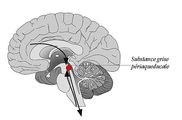 De façon schématique, la colonne la plus dorsale permettrait la coordination d'une réaction de défense, la plus ventrale celle d'une réaction d'immobilité et la colonne intermédiaire celle d'une fuite. Avec les moyens de l'époque (activation pharmacologique localisée dont la spécificité et la localisation restaient très incertaines ou marquage de l'expression de protéines révélatrices d'une activation neuronale soutenue), nous avions montré que la colonne ventrale pouvait être activée naturellement par un pincement de la nuque et induire une immobilisation (2). Par ailleurs, Richard Bandler et ses collaborateurs, avaient collecté plusieurs données suggérant que cette organisation en colonne existait également chez le chat. Ces données obtenues dans deux espèces différentes laissent penser que tous les mammifères, y compris l'homme, posséderaient une organisation semblable de leur substance grise périaqueducale. Hypothèse toutefois difficile à examiner car cette structure, très enfouie dans notre masse cérébrale est difficilement accessible aux techniques d'imagerie chez l'homme. De plus, à l'époque, l'étude de comportements aussi "basiques" n'était peut-être pas l'une des priorités dans la connaissance du cerveau.