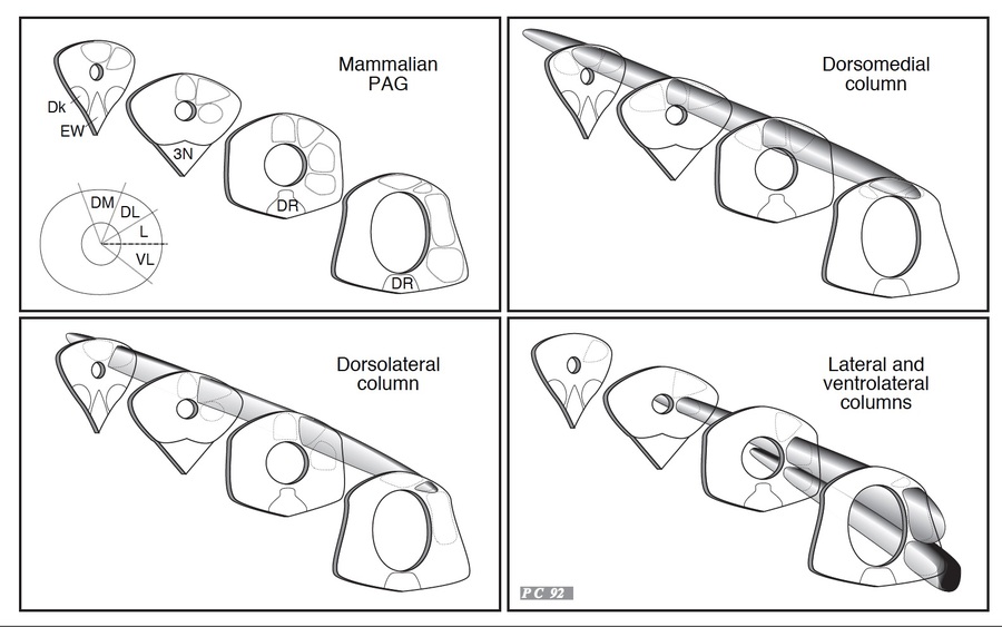 Dans les années '90, avec Richard Bandler, alors Professeur à l'Université de Sydney et grand spécialiste des réactions de défense, nous avions montré chez le rat (qui utilise avec brio chacune des trois stratégies) qu'une structure nerveuse appelée la "substance grise périaqueducale" (periaqueductal gray matter in English ou PAG pour les intimes!) possède des neurones dont la stimulation déclenche, selon leur localisation, l'une ou l'autre de ces trois stratégies. Plus précisément, et avec Pascal Carrive (actuellement Associate Professor à l'Université de Sydney), nous avions proposé que la partie latérale de cette belle substance grise - sorte de manchon de neurones autour de l'aqueduc de Sylvius, dans le mésencéphale - était organisée en colonnes orientées de façon antéro-postérieure avec des connexions différentes et des implications distinctes dans le contrôle des comportements de défense (1).