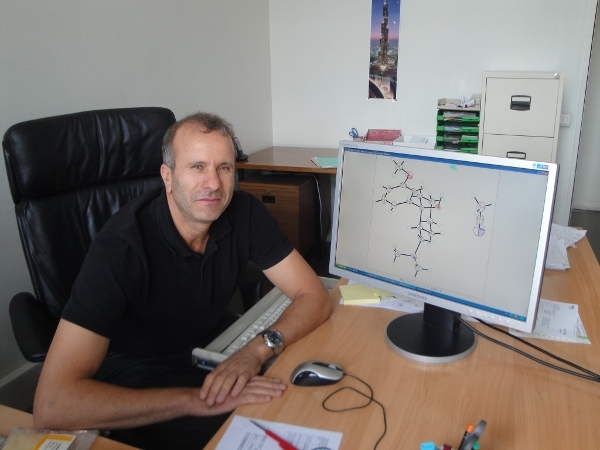 Pr Ahcène Boumendjel, chimiste au Dép. de Pharmacochimie Moléculaire, posant devant la structure moléculaire du tramadol