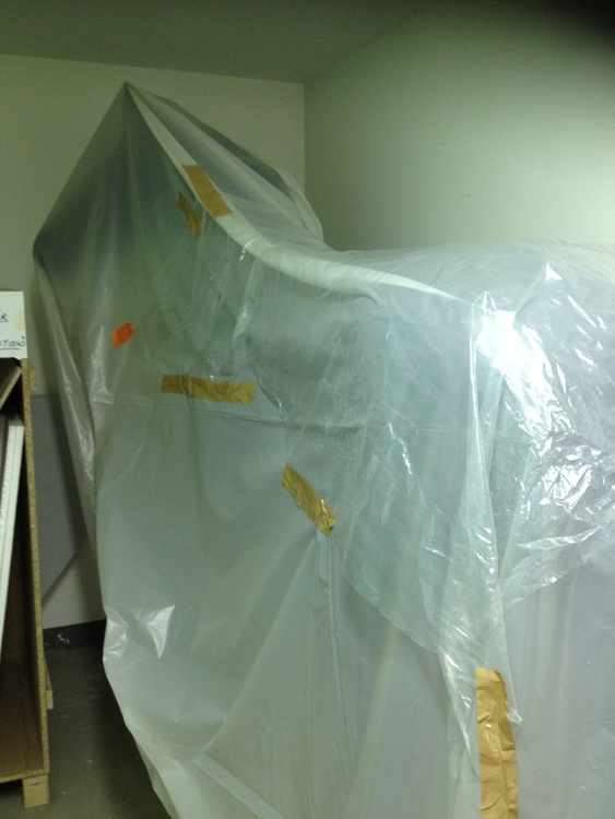 Retour du cheval exposé à Bourges pour la très intéressante exposition consacrée aux animaux de guerre dans le cadre du #Centenaire1418. Il est bâché pour subir un traitement de désinfection avant son retour en réserve. Gazé, lui aussi...Comme des millions d'équidés avant lui. J'ai beau être un éléphant imposant, cela me rend toute petite... Votre Eulalie.