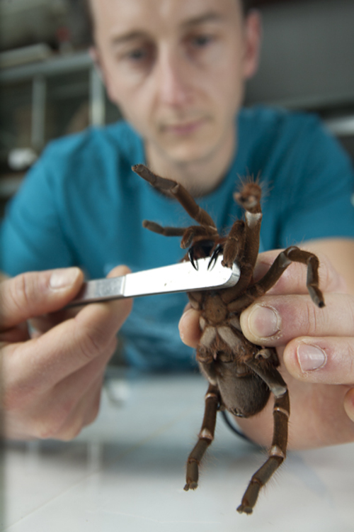De nombreuses entreprises françaises sont leader sur le marché de la molécule curative issue des venins... Venometech mais aussi la start-up grenobloise Smartox. En photo : le prélèvement du venin des Mygales chez Venometech (crédit : Denis Palanque)