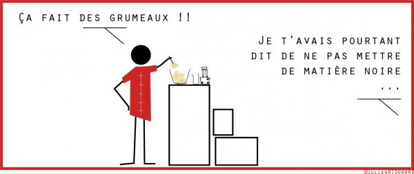 C’est là que la matière noire refait son apparition pour sauver la théorie ! Après le big-bang, les particules ne pouvaient pas se regrouper pour former des atomes à cause de la pression créée par les photons, ces grains de lumière, et les fluctuations primordiales étaient trop faibles. En revanche, la matière noire, elle, n’interagit pas avec les photons. Cette matière noire aurait donc pu créer des grumeaux, des fluctuations qui auraient permis la création des atomes, des galaxies et autres amas dans l’univers.