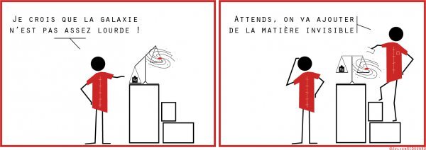 Le problème maintenant, c’est que l’on a ajouté de la masse que l’on ne voit pas. On va l’appeler matière noire, ou matière sombre, ou matière manquante, matière que l’on a ajoutée pour que notre loi fonctionne.