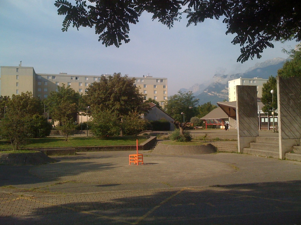 La chaise du soleil, située sur la place Michel Couëtoux. Pour le collectif, il s’agit de suivre le mouvement de la terre en regardant l’ombre des tours de l’autre côté de la rue. Cela se traduit par une chaise qui fait aussi office de cadran solaire, comme le souligne Kamel : « Le protagoniste est par ce mobilier placé au milieu de la ville et du temps : les rayons du soleil projettent l’ombre du pilier de la chaise, ainsi l’usager peut profiter du temps. Solaire, temporel, ou les deux ».