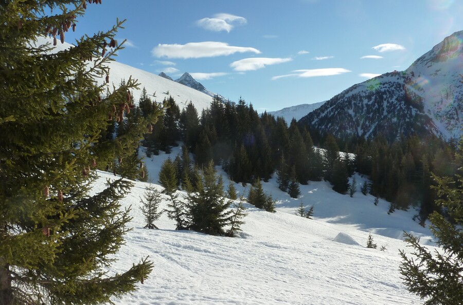 Le souffle se détend avec les premiers rayons de chaleur lumineuse. La pleine conscience inonde le corps et le cœur. Alors le voyage peut commencer, vraiment, juste au sortir de la forêt. Le vallon s’illumine et le corps jubile. Il n’a plus de poids. Je flotte dans le paysage. Je suis paysage. Des nuées de neige folles soulevées par la brise matinale, le contemple sous la voûte bleu ciel.