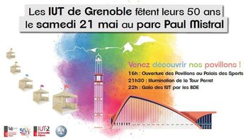 Dans le cadre de l’anniversaire de leurs 50 ans d’existence et d’innovation pédagogique, les Instituts Universitaires de Technologie de Grenoble (Université Grenoble Alpes) organisent une fête au cœur de leur ville, au Parc Paul Mistral le 21 mai 2016 dès 16h00.