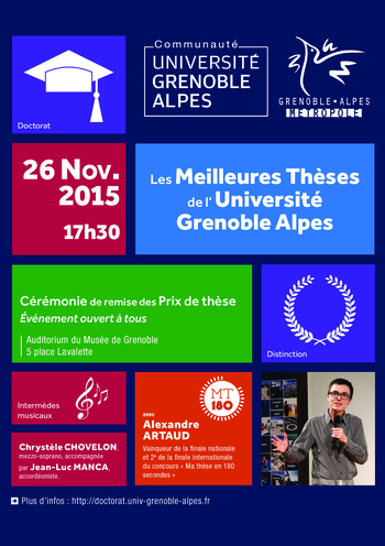 Le jeudi 26 novembre 2015, ces brillants jeunes Docteurs seront mis à l’honneur lors d’une cérémonie de remise du Prix de Thèse de l'Université Grenoble Alpes. Chaque lauréat recevra son prix après avoir brièvement exposé ses travaux.